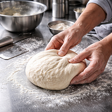 Wyrabiaj ciasto: jeśli używasz miksera z hakiem, wyrabiaj na średnich obrotach przez 7–9 minut aż będzie gładkie i elastyczne. Jeśli wyrabiasz ręcznie, posyp blat odrobiną mąki, wyłóż ciasto i wyrabiaj energicznie przez 10–12 minut: zgniataj i zagniataj, rozciągaj i składaj, aż przestanie kleić się do rąk i stanie się sprężyste.
