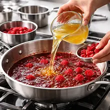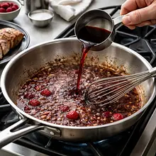 Do zredukowanego wina dodaj 250 ml bulionu i 150 g malin. Gotuj na średnim ogniu 6-8 minut, aż maliny rozpadną się, a płyn nabierze intensywnego koloru. Jeśli chcesz bardzo gładki sos, zmiksuj całość blenderem ręcznym bezpośrednio na patelni (krótkimi pulsacjami), a następnie przecedź przez drobne sitko do czystego rondelka, dociskając łyżką, aby uzyskać gładką teksturę. Odważ się na smak: dodaj 15 g octu balsamicznego i 3 g soli, sprawdź balans smaków.