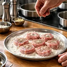 Przygotuj talerz z mąką. Oprósz delikatnie każdy medalion solą (ok. 0.3 g na medalion) oraz świeżo zmielonym pieprzem. Następnie lekko obtocz każdy medalion w mące — potrząśnij, aby usunąć nadmiar. Mąka stworzy cienką warstwę, która podczas smażenia zmieni się w złocistą skórkę i lekko zagęści sos.