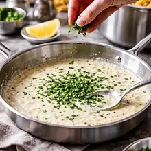 Dodaj do sosu świeże listki tymianku (opcjonalnie) lub drobno posiekaną natkę pietruszki, wymieszaj. Włóż medaliony z powrotem na patelnię do sosu na 1-2 minuty, aby się podgrzały i przeszły aromatem sosu. Nie gotuj długo — mięso ma tylko się przegotować, a nie wysuszyć.