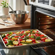 Po 10 minutach pieczenia warzyw, wyjmij blachę z piekarnika. Przesuń warzywa na jedną stronę, a na wolnym miejscu ułóż przygotowany filet z łososia (skórą do dołu, jeśli ją ma). Wstaw blachę z powrotem do piekarnika i piecz wszystko razem przez kolejne 12-15 minut. Czas pieczenia łososia zależy od grubości filetu. Będzie gotowy, gdy mięso łatwo będzie się rozdzielać pod naciskiem widelca i straci surowy, przezroczysty wygląd w środku.