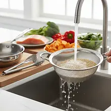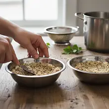 W czasie gdy warzywa i ryba się pieką, ugotuj komosę. Wsyp 100g komosy na drobne sitko i bardzo dokładnie przepłucz pod zimną, bieżącą wodą, mieszając ją palcami przez około minutę. Ten krok usuwa saponiny, które nadają gorzki smak. Przełóż opłukaną komosę do małego garnka, zalej 200 ml zimnej wody (proporcja 1:2) i dodaj szczyptę soli (1g). Zagotuj na dużym ogniu, a następnie zmniejsz ogień do minimum, przykryj garnek pokrywką i gotuj przez około 15 minut, aż cała woda zostanie wchłonięta.
