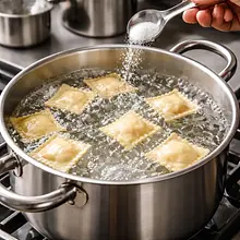 Użyj dużej łyżki cedzakowej, aby delikatnie zanurzyć i wyjmować ravioli. Nie gotuj zbyt długo — rozmoczone ciasto będzie się rozpadać. Jeśli gotujesz partie, trzymaj już ugotowane ravioli w ciepłej misce, aż wszystkie będą gotowe.