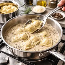 Użyj szerokiej łyżki do delikatnego mieszania — nie mieszaj agresywnie, by nie rozerwać ravioli. Podawaj natychmiast, bo sos i ravioli najlepiej smakują świeże i gorące.