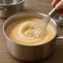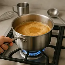 Postaw garnek na kuchence na średniej mocy palnika. Powoli podgrzewaj mieszankę, aż stanie się bardzo gorąca i zaczną pojawiać się pierwsze małe bąbelki na powierzchni, co oznacza, że jest bliska wrzenia. To kluczowy moment - nie dopuść do zagotowania! Gdy tylko zauważysz te bąbelki, natychmiast zmniejsz moc palnika do absolutnego minimum.