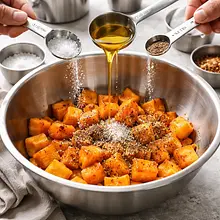 Do miski z dynią dodaj 15 g oliwy z oliwek (1 łyżka), 1 g soli i 1 g pieprzu (razem z przyprawami) i dokładnie wymieszaj ręką lub łyżką tak, aby każdy kawałek był lekko pokryty oliwą. Rozłóż kostki dyni równomiernie na blaszce wyłożonej papierem do pieczenia (nie układaj warstwą), piecz w rozgrzanym piekarniku przez 25–30 minut aż brzegi się lekko zrumienią, a środek stanie się miękki — sprawdzisz to widelcem, który powinien łatwo wchodzić, ale nie rozgniatać kawałka całkowicie. Na drugiej blasze wymieszaj połówki brukselki z pozostałą oliwą (5 g), szczyptą soli (1 g) i rozłóż obok dyni na 15 minut pieczenia; brukselka powinna się lekko przyrumienić na krawędziach i zachować wnętrze chrupkie.