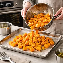 Rozgrzej piekarnik do 200°C z termoobiegiem (220°C bez termoobiegu). Dynię przełóż do dużej blachy, skrop 20 ml oliwy i delikatnie posól (użyj 1 szczypty soli). Wymieszaj, aby kostki były pokryte oliwą. Rozłóż w jednej warstwie (nie za ciasno) i piecz 25-30 minut, aż krawędzie zaczną się lekko karmelizować, a miąższ będzie miękki przy nakłuciu widelcem. Po wyjęciu z piekarnika odstaw na 5 minut — dynia lekko stwardnieje i utrzyma formę w sałatce.