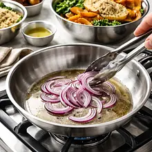 Na dużej patelni rozgrzej 10 ml oliwy na średnim ogniu. Dodaj cienkie półplasterki czerwonej cebuli i smaż 2-3 minuty aż staną się miękkie i półprzezroczyste. Dodaj plastry gruszki i smaż bez mieszania 2 minuty, aby ładnie się zarumieniły, następnie delikatnie przewróć i smaż kolejne 1-2 minuty. Dodaj 15 ml syropu klonowego (lub miodu) i mieszaj przez 30-60 sekund, aż sok delikatnie się skarmelizuje na owocach i cebuli. Gotowe, gdy gruszka jest miękka na brzegach, ale nadal trzyma kształt.