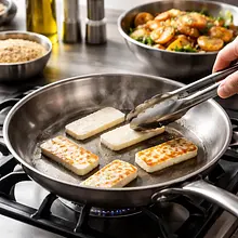 Rozgrzej suchą patelnię (bez tłuszczu) na średnio-wysokim ogniu. Gdy jest gorąca, połóż plastry halloumi i smaż 1,5-2 minuty z każdej strony, aż powstanie złota, chrupiąca skórka. Halloumi powinno być sprężyste i lekko ciągnące w środku. Jeśli patelnia przywiera, dodaj 5 ml oliwy i dokończ smażenie.