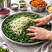Wrzuć porwane liście jarmużu do dużej miski, dodaj 15 g oliwy z oliwek (1 łyżka) i szczyptę soli (1 g). Masuj liście rękami przez około 1-2 minuty — wewnętrzna struktura liścia powinna zmięknąć i stracić szorstkość, kolor stanie się nieco ciemniejszy i błyszczący.