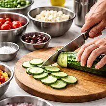 Umyj wszystkie warzywa pod bieżącą, zimną wodą. Osusz ręcznikiem kuchennym lub odwirowaniem w wirówce do sałaty. Sprawdź, czy pomidory nie mają miękkich miejsc — jeśli są duże, pokrój na ósemki; jeśli mniejsze, na ćwiartki.
