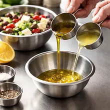 Do małej miseczki wlej 45 ml oliwy z oliwek i 30 ml świeżo wyciśniętego soku z cytryny. Dodaj 2 g suszonego oregano (około 1 płaska łyżeczka), 2 g soli i 1 g świeżo zmielonego pieprzu. Mieszaj energicznie trzepaczką lub widelcem przez około 20–30 sekund, aż składniki się połączą i dressing stanie się lekko mętny.
