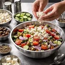 Ułóż sałatkę na talerzach lub w dużej salaterce. Na wierzchu rozłóż kostki lub pokruszoną fetę równomiernie. Jeśli używasz kaparów lub świeżego oregano (opcjonalne), rozrzuć je teraz dla kontrastu smakowego i dekoracji.
