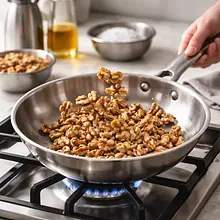 Rozgrzej suchą patelnię na średnim ogniu. Wrzuć orzechy włoskie (80 g) i praż je 3–4 minuty, potrząsając patelnią co kilkanaście sekund, aż poczujesz ich aromat i zobaczysz lekki rumieniec. Uważaj, by ich nie przypalić — przypalone orzechy robią się gorzkie. Po zdjęciu z ognia przestudź i w razie potrzeby pokrój nożem na większe kawałki.