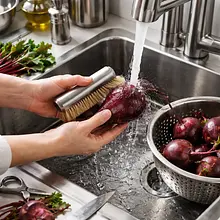 Piecz buraki w rozgrzanym piekarniku przez 45–60 minut w zależności od wielkości. Sprawdź miękkość po 45 minutach: włóż cienki nóż lub widelec w środek buraka — powinien wślizgiwać się gładko bez oporu. Po upieczeniu wyjmij buraki i odstaw na 10–15 minut, aż będą na tyle chłodne, by je dotknąć.