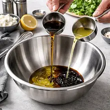Użyj łyżeczki do dokładnego skropienia dressingu. Dodatkowo można dodać odrobinę zredukowanego octu balsamicznego (glazury) dla efektu dekoracyjnego — to opcjonalny krok.