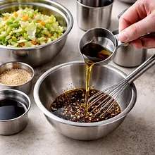 Przygotuj dressing: w małej misce połącz sos sojowy (30 ml), ocet ryżowy (30 ml), olej sezamowy (30 ml) i miód (20 g). Dodaj drobno posiekany lub przeciśnięty czosnek (10 g). Mieszaj energicznie widelcem lub trzepaczką przez 30–45 sekund, aż składniki się połączą i powstanie jednolita emulsja. Spróbuj dressing i ewentualnie dopraw solą (ostrożnie) oraz pieprzem.