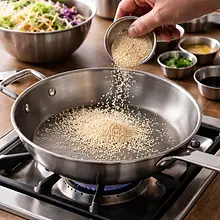 Rozgrzej suchą, średniej wielkości patelnię (najlepiej nieprzywierającą) na średnim ogniu. Wsyp sezam (20 g) i praż, ciągle mieszając lub potrząsając patelnią przez 2–3 minuty, aż nasiona będą złociste i zaczną wydzielać orzechowy aromat. Uważaj — sezam szybko się przypala. Po uprażeniu przełóż nasiona do miseczki, aby zatrzymać proces prażenia.