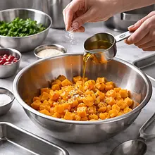 Do miski z dynią wlej 2 łyżki (30g) oliwy z oliwek, wsyp około połowy przygotowanej soli (2-3 szczypty) i pieprzu (1 szczypta). Używając dłoni lub dużej łyżki, dokładnie wymieszaj wszystko, tak aby każda kostka dyni została równomiernie pokryta cienką warstwą oliwy i przypraw. Następnie rozłóż zamarynowaną dynię na przygotowanej blasze, formując pojedynczą warstwę. Wstaw do nagrzanego piekarnika i piecz przez 25-30 minut. Dynia jest gotowa, gdy widelec wchodzi w nią bez oporu, a jej krawędzie są apetycznie przyrumienione i lekko skarmelizowane.