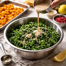 Podczas gdy dynia się piecze, przygotuj sos. Do małej miski lub słoika z zakrętką dodaj pastę tahini, syrop klonowy, świeżo wyciśnięty sok z cytryny, pozostałe 3 łyżki (45g) oliwy z oliwek oraz resztę soli i pieprzu.