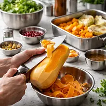 Nagrzej piekarnik do 200°C z funkcją termoobiegu lub 220°C bez termoobiegu. Dynię obierz nożem (najpierw odetnij obie końcówki, następnie przekrój na pół i wyjmij nasiona łyżką). Pokrój miąższ w kostkę o boku około 2 cm (równomierne kawałki pieką się jednakowo). Umieść kawałki dyni na dużej blaszce wyłożonej papierem do pieczenia w jednej warstwie — nie wkładaj ich gęsto obok siebie. Skrop 20 g oliwy z oliwek (około 1 i 1/3 łyżki), posól 1,5 g soli i delikatnie wymieszaj rękami lub silikonową łopatką, aby każdy kawałek był pokryty tłuszczem. Piecz przez 25–30 minut, aż dynia będzie miękka w środku (włóż widelec — powinien gładko wchodzić) i zacznie się lekko karmelizować na brzegach (złociste plamki).