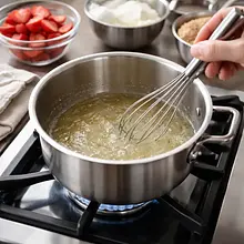 Rozpuszczenie żelatyny: po napęcznieniu podgrzej żelatynę do rozpuszczenia. Możesz to zrobić nad małym rondelkiem z gotującą się wodą (kąpiel wodna) - ustaw miskę z żelatyną nad parą i mieszaj do rozpuszczenia (ok. 30–60 sekund). Alternatywnie podgrzej w mikrofalówce 8–12 sekund — mieszaj po 6 sekundach. Żelatyna powinna być klarowna i płynna; nie dopuszczaj do wrzenia, bo straci właściwości żelujące.