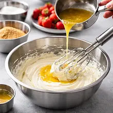 Ubijanie śmietanki: w oddzielnej, bardzo zimnej misce ubij 300 ml schłodzonej śmietanki 30% na sztywne, ale kremowe piki. Zacznij na niskich obrotach przez 20–30 sekund, potem zwiększ prędkość; śmietanka powinna tworzyć miękkie wierzchołki, które lekko się załamują po uniesieniu trzepaczki (ok. 2–3 minuty w zależności od urządzenia).