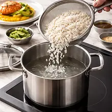 Odważ 300 g suchego ryżu do sushi i umieść w dużej misce. Zalej zimną wodą i delikatnie mieszaj ręką, po czym wylej mętną wodę. Powtarzaj płukanie 6–8 razy, aż woda będzie wyraźnie jaśniejsza (prawie czysta). Po ostatnim płukaniu zalej ryż zimną wodą i odstaw na sitku na 10–15 minut, aby nadmiar wody spłynął.