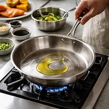 Rozgrzej dużą patelnię na średnio-wysokim ogniu (najlepsza patelnia to żeliwna lub stalowa). Osusz 600 g filetu z łososia papierowym ręcznikiem i podziel na 4 równe porcje. Skrop lekko solą (ok. 1 g na porcję). Na gorącej patelni smaż filety 2–3 minuty z jednej strony, aż uzyskasz złoto-brązowy kolor. Obróć filety i 1 minutę smaż z drugiej strony, a następnie zmniejsz ogień.