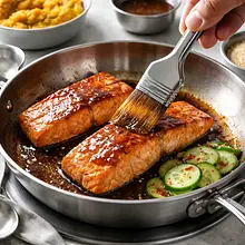 Po wstępnym podsmażeniu posmaruj wierzch każdego filetu grubą warstwą przygotowanej glazury (około 10–15 g na filet). Przełóż filety na blachę i wstaw pod grill (broiler) w piekarniku nagrzanym do maksymalnej temperatury na 3–5 minut, aż glazura zacznie się karmelizować i lekko bąbelkować. Uważaj, by nie przepiec — środek powinien pozostać soczysty (temperatura wewnętrzna 52–55°C) lub filet powinien łatwo się rozdzielać widelcem, ale zachowywać wilgotność.