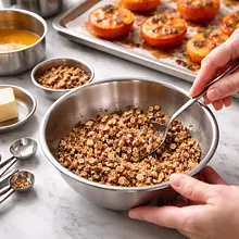 Nagrzej piekarnik do 190°C (góra-dół). Owiń blachę papierem do pieczenia. Kaki umyj, przetnij na pół wzdłuż, usuń zieloną szypułkę (jeśli jest twarda) i ułoż je skórą do dołu na blasze. Jeżeli miąższ jest bardzo twardy, nanóż na każdą połówkę 5 g miodu (około 1 łyżeczka) i lekko posyp cynamonem. Piecz 20-25 minut — owoc powinien zmięknąć, a brzegi lekko się skarmelizować. Sprawdź miękkość widelcem: powinien łatwo wchodzić w miąższ i wyciskać lekko musowatą konsystencję.