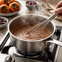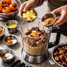 Sprawdź kasztany: jeśli są surowe i twarde, wrzuć je do garnka z wodą i gotuj na małym ogniu 15-20 minut aż będą całkowicie miękkie (wkłuj nożem — powinien łatwo wchodzić). Jeśli używasz gotowych, obranych kasztanów, przejdź dalej. Odmierz 300 g kasztanów i włóż je do blendera kielichowego lub użyj ręcznego blendera z wysokim naczyniem.