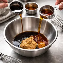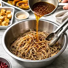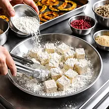 Nagrzej piekarnik do 200°C (termoobieg 190°C). Przygotuj kabocha: ułóż dynię na desce, przetnij ostrym nożem na pół, wyjmij łyżką nasiona (możesz je odłożyć do upieczenia oddzielnie). Pokrój połowy na plastry, a następnie w kostkę o boku 2-3 cm — skórka Hokkaido jest jadalna po upieczeniu, więc nie obieraj. Umieść pokrojoną dynię w dużej misce.
