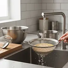 Odmierz 50g suchej komosy ryżowej. Przesyp ją na drobne sitko i płucz bardzo dokładnie pod zimną, bieżącą wodą przez około minutę, mieszając ziarna dłonią. To kluczowy krok, aby pozbyć się naturalnej goryczki. Do małego garnka wlej 100 ml wody (zachowaj proporcję 1:2, czyli dwie części wody na jedną część komosy), dodaj szczyptę soli i zagotuj. Wsyp opłukaną komosę, zamieszaj, zmniejsz ogień do minimum, przykryj garnek pokrywką i gotuj przez około 15 minut. Po tym czasie cała woda powinna zostać wchłonięta. Zdejmij garnek z ognia i pozostaw pod przykryciem na kolejne 5 minut. Na koniec, delikatnie 'wzrusz' ugotowaną komosę widelcem, aby ziarna stały się puszyste. Odstaw do całkowitego wystudzenia.