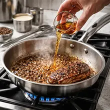 Zwiększ lekko ogień i wlej koniak (opcjonalnie) do patelni — około 30 ml — i natychmiast zdeglasuj, zeskrobując drewnianą łyżką przylegające kawałki z dna. Pozwól alkoholowi odparować około 30–45 sekund; jeśli chcesz, możesz ostrożnie podpalić (flambirować) — płomień szybko się ugasi i zostawi aromat. Jeśli nie używasz koniaku, pomiń ten etap i od razu wlej bulion wołowy.