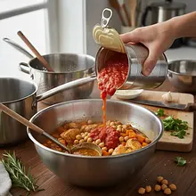 W osobnej misce lub dzbanku przygotuj sos. Wlej całą zawartość puszki krojonych pomidorów, dodaj bulion, wędzoną paprykę, suszone oregano oraz pozostałą sól i pieprz. Dokładnie wymieszaj wszystko za pomocą trzepaczki lub widelca, aż przyprawy równomiernie rozprowadzą się w płynie. Gotowym sosem zalej składniki w wolnowarze.