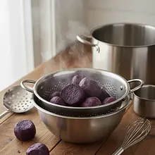 Odcedź ugotowane bataty na durszlaku i pozostaw na 2-3 minuty, aby dobrze odparowały. To ważny krok, by purée nie było wodniste. Gorące bataty przełóż z powrotem do suchego garnka lub do miski. Dodaj 15g masła (około jednej łyżki), śmietankę 30%, szczyptę soli i świeżo mielonego pieprzu. Zblenduj wszystko na idealnie gładką masę za pomocą blendera ręcznego (żyrafy). Jeśli purée jest za gęste, dodaj odrobinę więcej śmietanki. Spróbuj i w razie potrzeby dopraw solą i pieprzem.