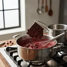 Gdy sos się zredukuje, zdejmij rondelek z ognia. Dodaj połamaną na małe kawałki gorzką czekoladę oraz pozostałe 5g masła (mała łyżeczka). Mieszaj energicznie rózgą kuchenną, aż czekolada i masło całkowicie się rozpuszczą i połączą z sosem. Sos stanie się błyszczący, gęsty i aksamitny. Spróbuj i dopraw szczyptą soli i pieprzu, aby zbalansować smaki. Trzymaj w cieple.