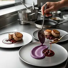 To nie jest zwykłe danie, to kulinarna podróż zaprojektowana, by pobudzić wszystkie zmysły. 'Synestezja Smaków' łączy w sobie zaskakujące, lecz doskonale harmonizujące elementy. Delikatna, soczysta polędwiczka wieprzowa, marynowana w ziołach i sosie sojowym, jest tu gwiazdą. Spoczywa na aksamitnym, intensywnie fioletowym purée z batata, którego naturalna słodycz stanowi idealne tło dla reszty kompozycji. Całość otula głęboki, wytrawny sos kawowo-wiśniowy z nutą gorzkiej czekolady i octu balsamicznego, który dodaje daniu tajemniczości i elegancji. Chrupiące, solone pistacje przełamują teksturę, a świeże mikrolistki wprowadzają element świeżości. To danie jest hołdem dla nowoczesnej kuchni europejskiej, która nie boi się eksperymentów. Idealne na romantyczną kolację lub specjalną okazję, gdy chcesz zaimponować gościom czymś więcej niż tylko jedzeniem – chcesz podarować im doświadczenie.