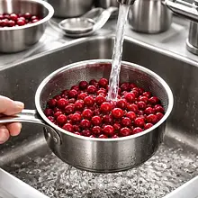 Opłucz żurawinę pod zimną wodą i odsącz. W małym rondelku o pojemności 1 l umieść żurawinę (100 g), dodaj 50 g brązowego cukru oraz 30 ml wody (ok. 30 g). Postaw rondel na średnim ogniu. Gdy zacznie się delikatnie gotować (małe bąbelki), zmniejsz ogień i gotuj 6-8 minut, mieszając drewnianą łyżką – żurawiny powinny pękać, a mieszanka stać się gęstsza i lekko błyszcząca. Po ugotowaniu zdejmij z ognia i odstaw na 3 minuty, następnie przeciśnij przez drobne sito, dociskając łyżką, aby uzyskać gładki syrop. Odstaw do lekkiego przestudzenia (do temperatury pokojowej).
