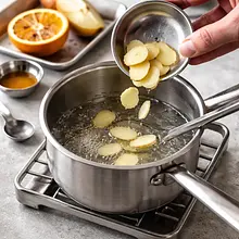 Odcedź syrop przez drobne sitko do miarki lub miseczki, aby usunąć plasterki imbiru (możesz zachować kilka plasterków jako dekorację). Sprawdź smak: jeśli zbyt ostry, dodaj 5–10 ml wody; jeśli zbyt słodki, wyciśnij odrobinę soku z cytryny (ok. 5 ml). Syrop powinien być aromatyczny, słodko-korzenny i przyjemnie ciepły.