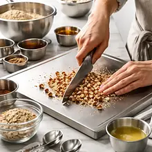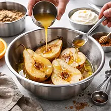 Rozgrzej piekarnik do 200°C (góra‑dół). Przygotuj naczynie żaroodporne o wymiarach ok. 20×20 cm lub małą brytfannę — lekko natłuść dno masłem lub wyłóż papierem do pieczenia. Umyj gruszki, osusz je papierowym ręcznikiem. Przekrój każdą gruszkę na pół wzdłuż, pozostawiając ogonek jeśli chcesz efektownie wyglądać. Łyżeczką wydrąż środek (miejsce z gniazdem nasiennym) na głębokość około 1–1,5 cm, aby sos mógł wniknąć do środka.
