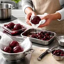 Jeśli używasz gotowanych buraków: wyjmij je z opakowania, osusz papierowym ręcznikiem i obierz cienko, trzymając buraka w dłoni i zdzierając skórkę nożem lub obieraczką. Jeśli używasz surowych buraków: umyj je pod bieżącą wodą szczotką do warzyw, osusz, owiń każdy burak w folię aluminiową po skropieniu 1 łyżką oliwy z oliwek (ok. 5 g na buraka) i piecz na blaszce w piekarniku nagrzanym do 200°C (opcja termoobieg 190°C) przez 35–45 minut, aż miękkość sprawdzisz wbijając nóż — powinien wchodzić z niewielkim oporem, a burak powinien być miękki w środku. Po upieczeniu ostudź 10–15 minut, zdejmij folię i obierz skórkę ręką lub nożem.