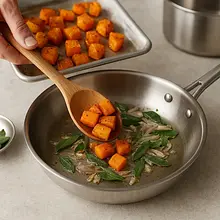 Na patelnię z szalotką i ziołami przełóż upieczone kawałki dyni. Za pomocą drewnianej łyżki lub tłuczka do ziemniaków rozgnieć dynię bezpośrednio na patelni, tworząc rodzaj rustykalnego purée. Nie musi być idealnie gładkie, małe kawałki dyni dodadzą tekstury.