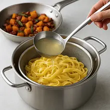 Zanim odcedzisz makaron, za pomocą chochelki lub kubka odlej około 250 ml (jedną szklankę) wody, w której się gotował. Jest ona pełna skrobi i pomoże idealnie połączyć sos z makaronem. Makaron odcedź i natychmiast przełóż go na patelnię z gorącym sosem dyniowym.