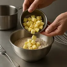 Do miski z suchymi składnikami dodaj 100g bardzo zimnego masła, pokrojonego w małą kostkę (ok. 1x1 cm). Teraz najważniejsza część: używając jedynie opuszków palców, szybko rozcieraj masło z mąką, aż całość będzie przypominać mokry piasek lub kruszonkę. Staraj się pracować szybko, aby masło się nie ogrzało od ciepła dłoni.