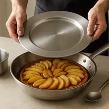 Przygotuj duży talerz lub paterę, o średnicy większej niż patelnia. Przykryj nią patelnię. Teraz najtrudniejszy moment: chwyć jednocześnie talerz i gorące uchwyty patelni (przez rękawice!). Zdecydowanym, szybkim ruchem odwróć całość do góry nogami. Postaw talerz na blacie i powoli unieś patelnię. Tarta powinna gładko opaść na talerz, odsłaniając skarmelizowane owoce.