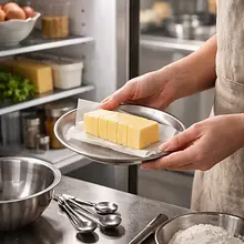 Rozcieranie masła: rozetrzyj masło z mąką palcami (metoda 'sable') aż nie będzie dużych kawałków masła — mieszanka powinna przypominać grube okruchy (wielkość ziaren grochu). Nie ogrzewaj masy zbyt długo palcami, pracuj szybko.