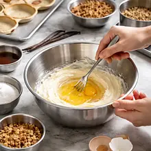 Ubijanie śmietanki: schłodzoną śmietankę 30% ubijaj w oddzielnej, dobrze schłodzonej misce mikserem na średnich obrotach do miękkich szczytów (ok. 2-3 minuty). Sprawdź: gdy podnosisz trzepaczkę, krem tworzy miękkie, opadające wierzchołki — nie ubijaj do masła.