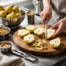 Przygotowanie gruszek: rozgrzej piekarnik do 180°C (grzanie góra-dół). Obierz gruszki, przekrój na pół lub ćwiartki i usuń gniazda nasienne. W misce wymieszaj gruszki z 60 g cukru brązowego, sokiem z cytryny i cynamonem, aby równomiernie pokryć kawałki.